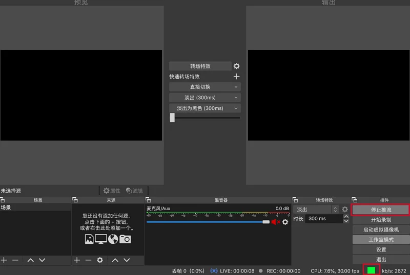 1、查看底部工具栏【控件】-点击【开始推流】,即可将视频流推送到设置的推流地址;