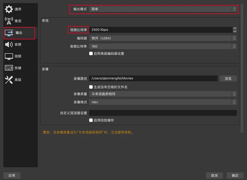底部工具栏【控件】-点击【设置】,进入设置界面-点击【输出】,选择输出模式【简单】-填写【视频比特率】,最后点击【确定】