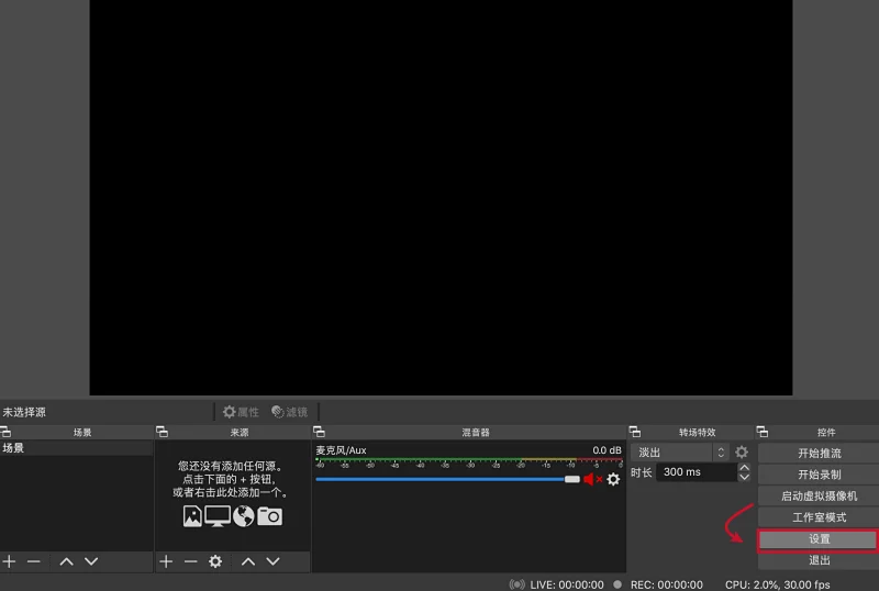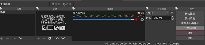 1、打开OBS-底部工具栏【控件】,点击【设置】