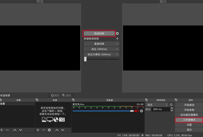 2、选择【转场特效】,可将预览窗的直播画面过度到输出窗口;